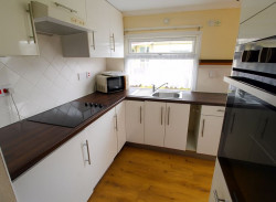 Kitchen Area - UPVC double glazed window to side elevation, modern fitted kitchen comprising a range of fitted wall and base units with rolled edge work surfaces incorporating single drainer sink unit with mixer tap, integrated fridge and freezer, built-in electric oven with four ring electric hob, feature down lighters, laminate flooring, open access to the hallway, television point, power points.