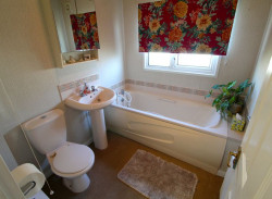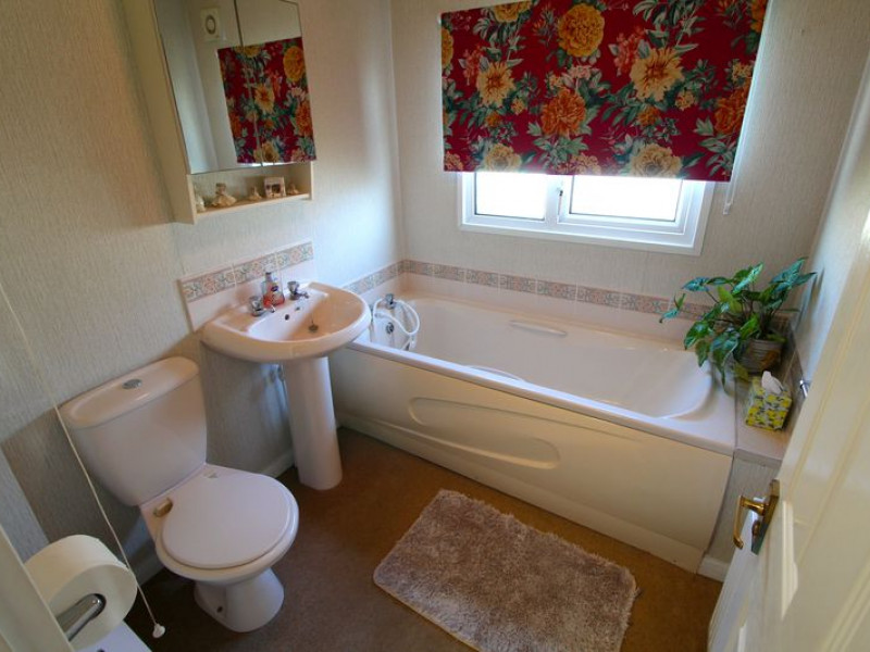 Bathroom - UPVC double glazed obscure window to side elevation, modern fitted suite comprising panelled bath, pedestal wash hand basin with tiled splash backs, WC, radiator, wall extractor fan.