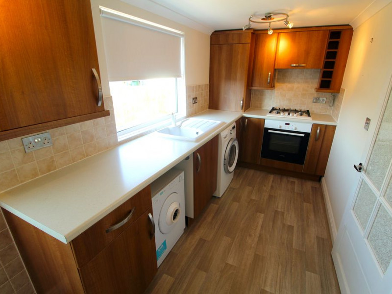 Kitchen - UPVC double glazed window and UPVC double glazed half obscure door to rear elevation, modern fitted kitchen comprising a range of fitted wall and base units with rolled edge work surfaces incorporating single drainer sink unit with mixer tap, built-in electric oven with four ring gas hob and concealed cooker hood over, plumbing for automatic washing machine, space for two level white goods, e.g. fridge and freezer, radiator, Worcester Bosch gas boiler well concealed via the kitchen wall unit, power points.
