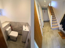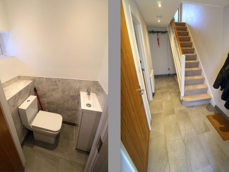 Downstairs WC - UPVC double glazed obscure window to front elevation, modern white suite comprising WC and wash basin with mixer tap, tiled splash backs and useful storage cupboard below, feature down lighters, a continuation of the feature tiled flooring.