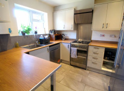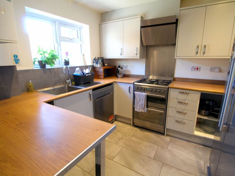 Kitchen - UPVC double glazed window to front elevation, modern fitted kitchen comprising a range of fitted wall and base units with rolled edge work surfaces incorporating single drainer sink unit with mixer tap and tiled splash backs, plumbing for dishwasher, space for cooker with gas and electric cooker points, fitted cooker hood over, space for upright fridge/freezer, radiator, a continuation of the feature tiled flooring, wall mounted Vaillant boiler, feature down lighters, power points.