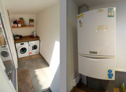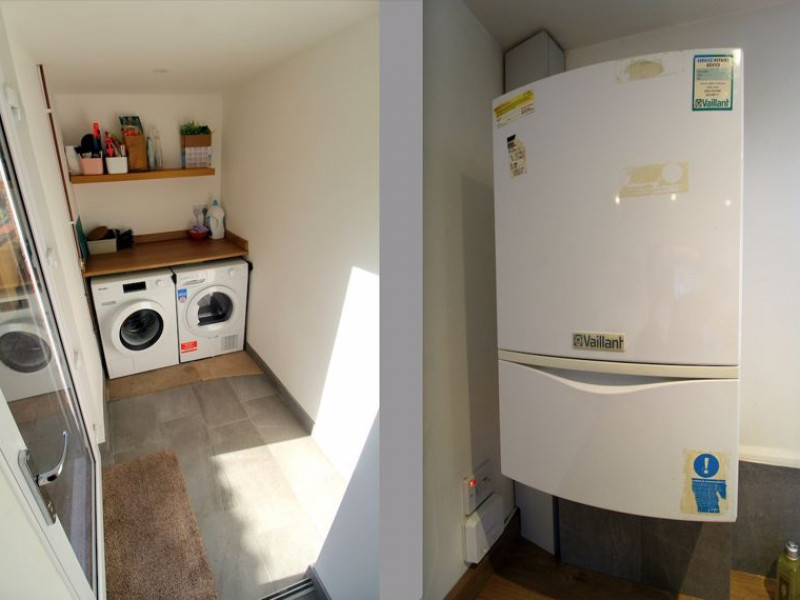 Utility Room - UPVC double glazed door giving access to the rear garden, rolled edge work surface with space for low level white goods below, e.g. washing machine and tumble dryer, plumbing for automatic washing machine, feature down lighters, a continuation of the feature tiled flooring, power points.