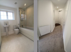 Bathroom - UPVC double glazed obscure window to side elevation, modern white suite comprising pedestal wash hand basin with mixer tap and tiled splash backs, WC and bath with mains shower over, ceiling extractor fan, radiator, shaver point, feature down lighters.
