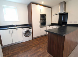 Kitchen Area - UPVC double glazed window to side elevation, modern fitted kitchen comprising a range of fitted wall and base units with work surfaces incorporating stainless steel one and a half bowl single drainer sink unit with mixer tap, built-in electric oven with four ring electric hob and fitted cooker hood over, built-in microwave, built-in fridge and freezer, plumbing for automatic washing machine, feature down lighters, power points.