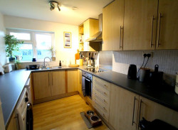 Kitchen - UPVC double glazed window to rear elevation, modern fitted kitchen comprising a range of fitted wall and base units with rolled edge work surfaces incorporating stainless steel one and half bowl single drainer sink unit with mixer tap and tiled splash backs, built-in electric oven with four ring electric hob and fitted cooker hood over, space for upright fridge/freezer, plumbing for washing machine, power points.