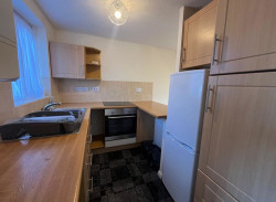 Lounge with wood effect flooring. - Fitted kitchen with oven, hob, fridge/freezer only.