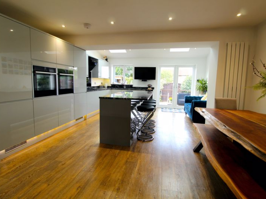 Kitchen/Diner - UPVC double glazed window and matching French doors to rear elevation, twin Velux style double glazed windows to rear elevation with feature down lighters, a continuation of the feature vinyl flooring, modern fitted kitchen comprising a range of fitted wall and base units with feature granite work surfaces incorporating sink unit with mixer tap, four ring induction hob with cooker hood over, built-in Neff double oven, integrated wine cooler, further integrated appliances including fridge, freezer and dishwasher, a continuation of the feature down lighters, timber glazed door to the utility room, power points.