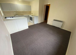 Open aspect lounge. - Kitchen with cooker, fridge and washing machine.