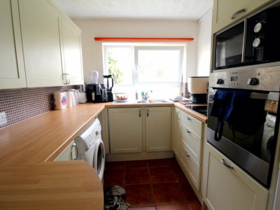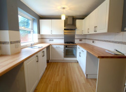 Kitchen - UPVC double glazed window to rear elevation, UPVC double glazed door to rear elevation (not currently in use), modern fitted kitchen comprising a range of fitted wall and base units with rolled edge work surfaces incorporating circular sink unit with mixer tap, built-in electric oven with four ring gas hob and fitted cooker hood over, plumbing for an automatic washing machine, space for upright fridge/freezer, space for additional low level white good, timber glazed door through to the additional reception room/dining room, laminate flooring, power points.