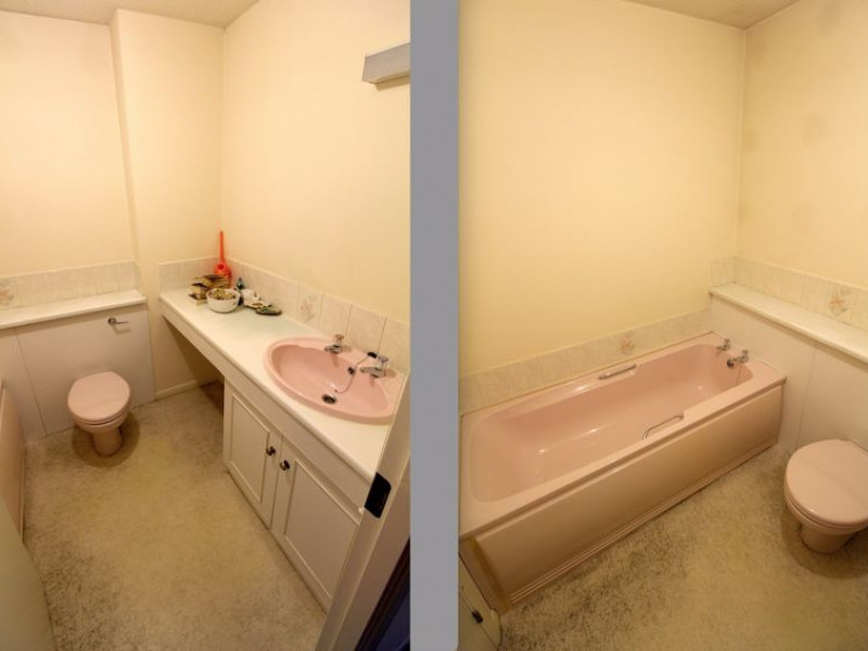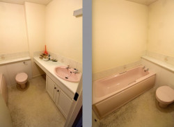 Bathroom - Pink suite comprising bath with grab handles, inset wash basin and WC with concealed cistern, shaver point and light, ceiling extractor fan.