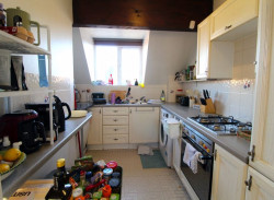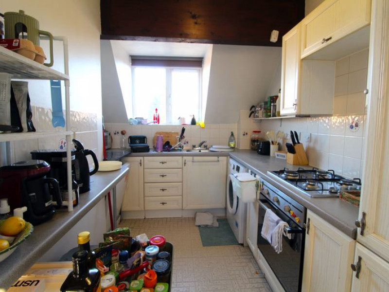 Kitchen - UPVC double glazed leaded light window to front elevation, modern kitchen comprising a range of fitted wall and base units with rolled edge work surfaces incorporating stainless steel single drainer sink unit with mixer tap and tiled splash backs, built-in electric oven with four ring gas hob, plumbing for automatic washing machine, space for upright fridge/freezer, ceiling extractor fan, feature exposed beam, small breakfast bar area, power points.