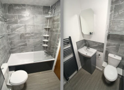 Bathroom - Newly fitted modern suite comprising bath with mixer tap and shower attachment over, WC and wash hand basin with mixer tap, tiled splash backs and useful storage cupboard below, heated towel rail, part tiled walls, ceiling extractor fan.