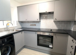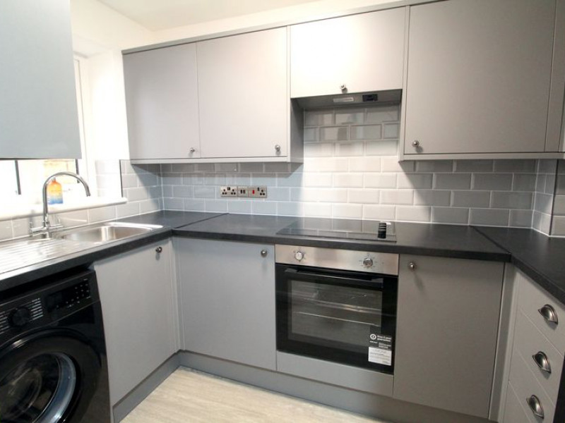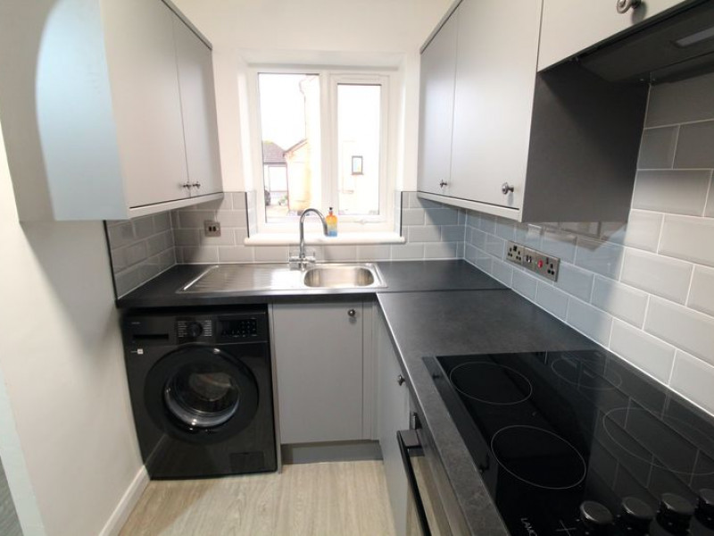 Kitchen - UPVC double glazed window to front elevation, newly fitted modern kitchen comprising a range of fitted wall and base units with rolled edge work surfaces incorporating stainless steel single drainer sink unit with mixer tap and tiled splash backs, built-in electric oven with four ring electric hob and fitted cooker hood over, plumbing for automatic washing machine, space for upright fridge/freezer, a continuation of the hard flooring, power points.