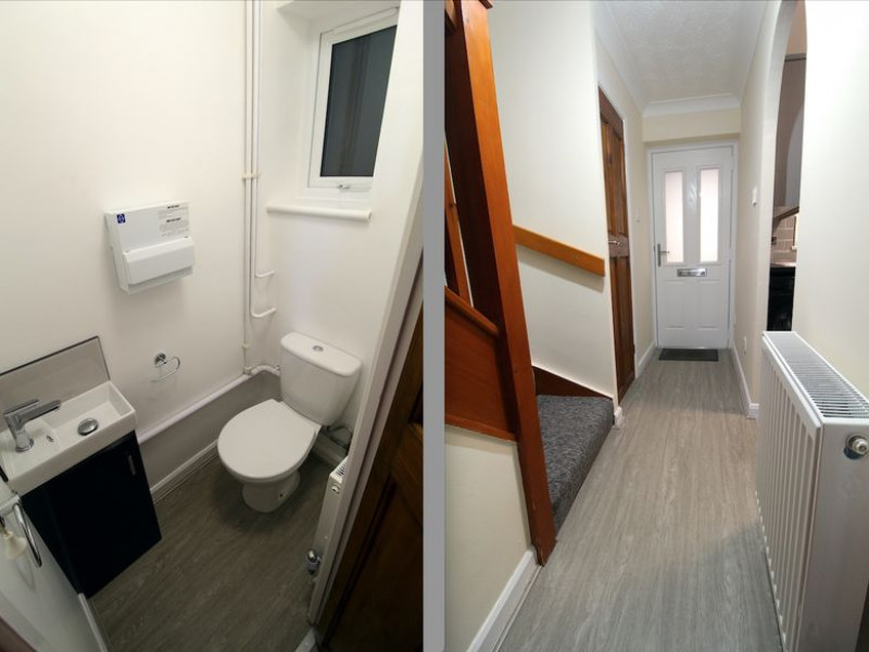 Downstairs WC - UPVC double glazed obscure window to front elevation, newly fitted white suite comprising WC and corner wash basin with mixer tap, splash backs and useful storage cupboard below, a continuation of the hard flooring.