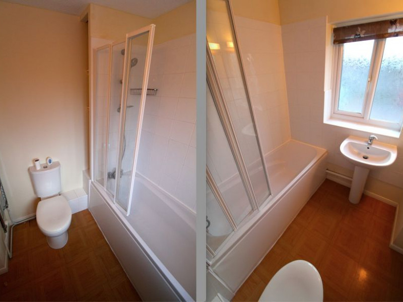 Bathroom - UPVC double glazed obscure window to front elevation, modern white suite comprising panelled bath with glazed folding shower screen, mixer tap and shower attachment, WC and pedestal wash hand basin with mixer tap, heated towel rail, ceiling extractor fan, shaver point and light, part tiled walls, hard flooring.