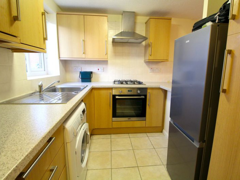 Kitchen - UPVC double glazed window to front elevation, modern fitted kitchen comprising a range of fitted wall and base units with work surfaces incorporating stainless steel single drainer sink unit with mixer tap and splash backs, built-in electric oven with four ring gas hob and cooker hood over, plumbing for automatic washing machine, space for upright fridge/freezer, wall mounted Worcester Bosch gas boiler well concealed via the kitchen wall unit, power points.