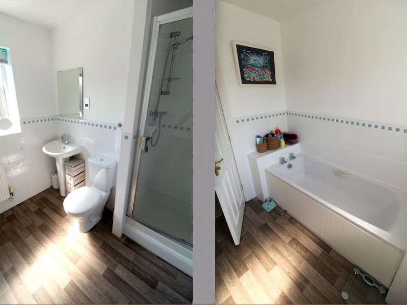 Bathroom - UPVC double glazed obscure window to rear elevation, radiator, modern white suite comprising WC, pedestal wash hand basin with mixer tap and tiled splash backs, panelled bath, part tiled walls, separate fully tiled shower cubicle with mains shower, ceiling extractor fan.