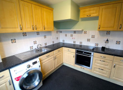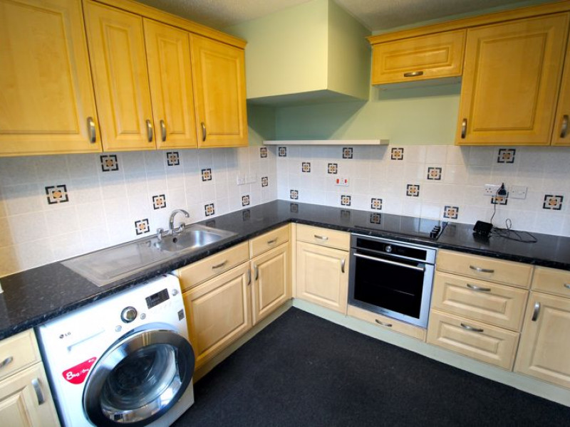 Kitchen - UPVC double glazed window and matching half obscure door to rear elevation, modern fitted kitchen comprising a range of fitted wall and base units with rolled edge work surfaces incorporating stainless steel single drainer sink unit with mixer tap and tiled splash backs, built-in electric oven with four ring electric hob, space and plumbing for automatic washing machine, space for upright fridge/freezer, power points.