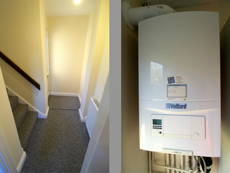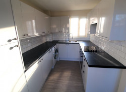 Kitchen - UPVC double glazed window to front elevation, UPVC half double glazed door to rear elevation, newly fitted modern kitchen comprising a range of fitted wall and base units with rolled edge work surfaces incorporating stainless steel single drainer sink unit with mixer tap and tiled splash backs, plumbing for automatic washing machine, built-in electric oven with four ring electric hob and fitted cooker hood over, wall mounted Vaillant gas boiler, radiator, space for upright fridge/freezer, power points.