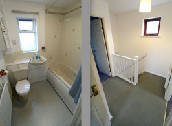 Bathroom - Double glazed obscure timber window to side elevation, bathroom suite comprising panelled bath with grab handles and electric shower over, inset wash basin with storage below, WC, radiator.