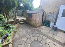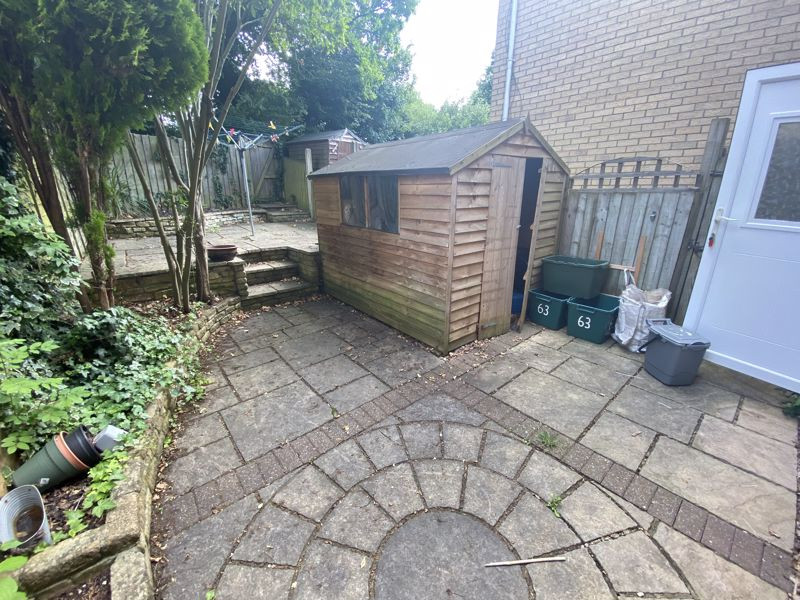 Rear garden with storage shed.