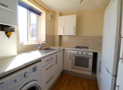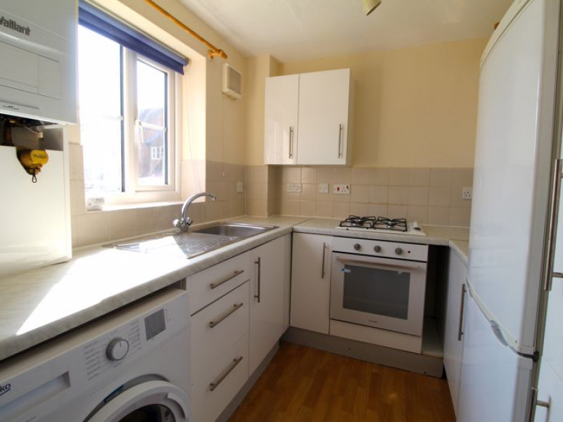 Kitchen - UPVC double glazed window to front elevation, fitted kitchen comprising a range of fitted wall and base units with rolled edge work surfaces incorporating stainless steel single drainer sink unit with mixer tap and tiled splash backs, built-in electric oven with four ring gas hob, plumbing for automatic washing machine, space for upright fridge/freezer, wall mounted Vaillant combi gas boiler, power points.