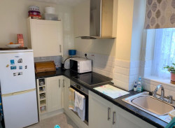 An entrance lobby. - Modern kitchen with oven, hob, hood, washing machine and fridge/freezer.