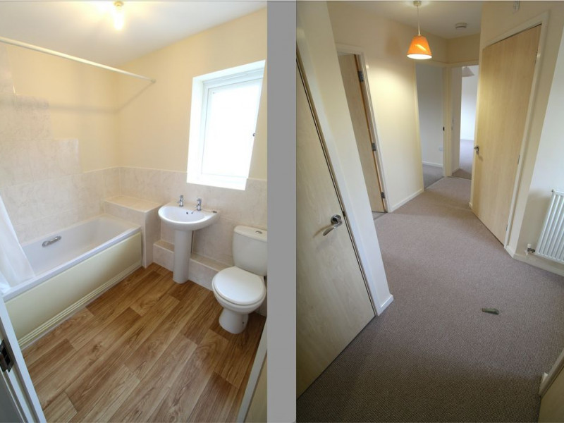 Bathroom - UPVC double glazed obscure window to rear elevation, modern white suite comprising WC, pedestal wash hand basin with tiled splash backs and bath with grab handles, mixer tap and shower attachment over, radiator, Vent Axia ceiling extractor fan, part tiled walls.