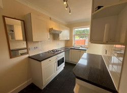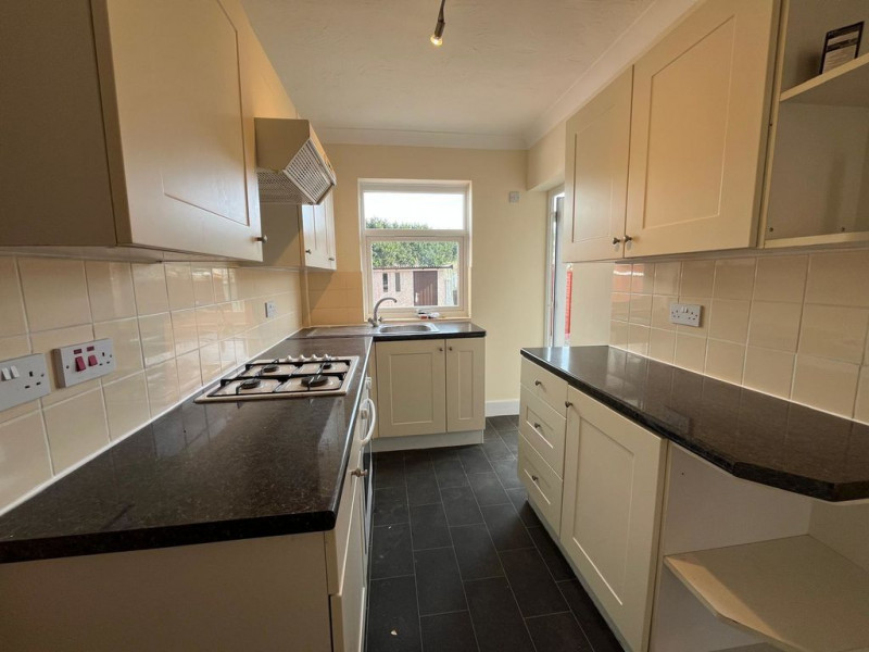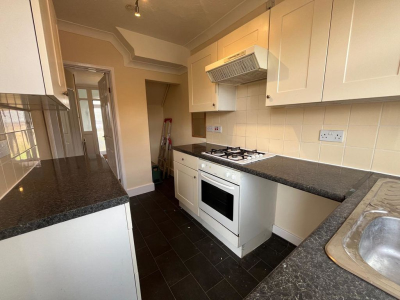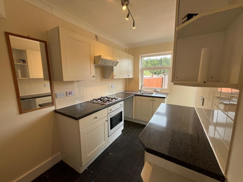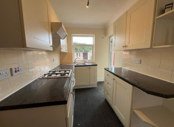 Low maintenance rear garden - Kitchen with oven, hob, hood only. **Spaces for your fridge freezer and washing machine**