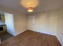 Lounge with laminate flooring. - Kitchen with oven, hob, fridge and washing machine.