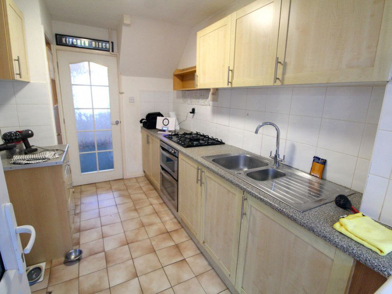Kitchen - UPVC double glazed door with aluminium window to the rear porch/extension, tiled flooring, modern fitted kitchen comprising a range of fitted wall and base units with rolled edge work surfaces incorporating one and a half bowl single drainer sink unit with mixer tap and tiled splash backs, built-in electric oven with five ring gas hob, handy built-in storage cupboard, sliding door to the dining room, power points.