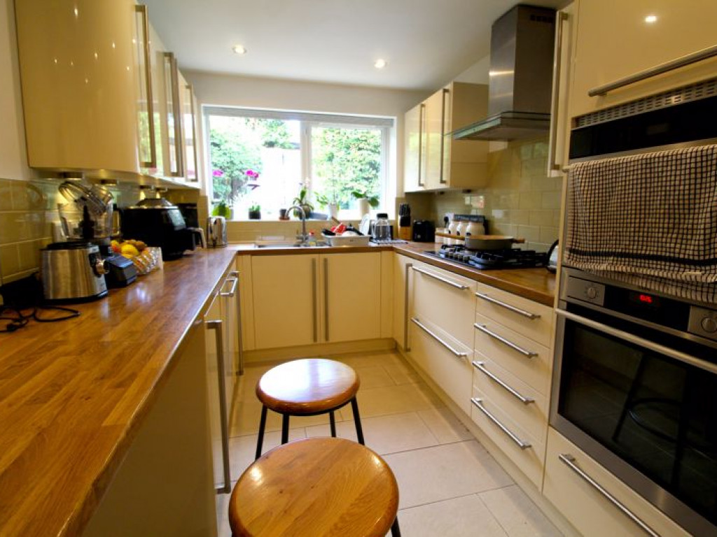Kitchen - UPVC double glazed window to rear elevation, modern fitted kitchen comprising a range of fitted wall and base units with rolled edge work surfaces incorporating fitted five ring gas hob with fitted cooker hood over, integrated double oven, integrated fridge, freezer and dishwasher, one and a half bowl single drainer sink unit with mixer tap and tiled splash backs, breakfast bar, tiled flooring feature down lighters, radiator, power points.