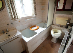 Bathroom - UPVC double glazed obscure window to side elevation, bath, WC and sink, fitted but in need of replacement, radiator.